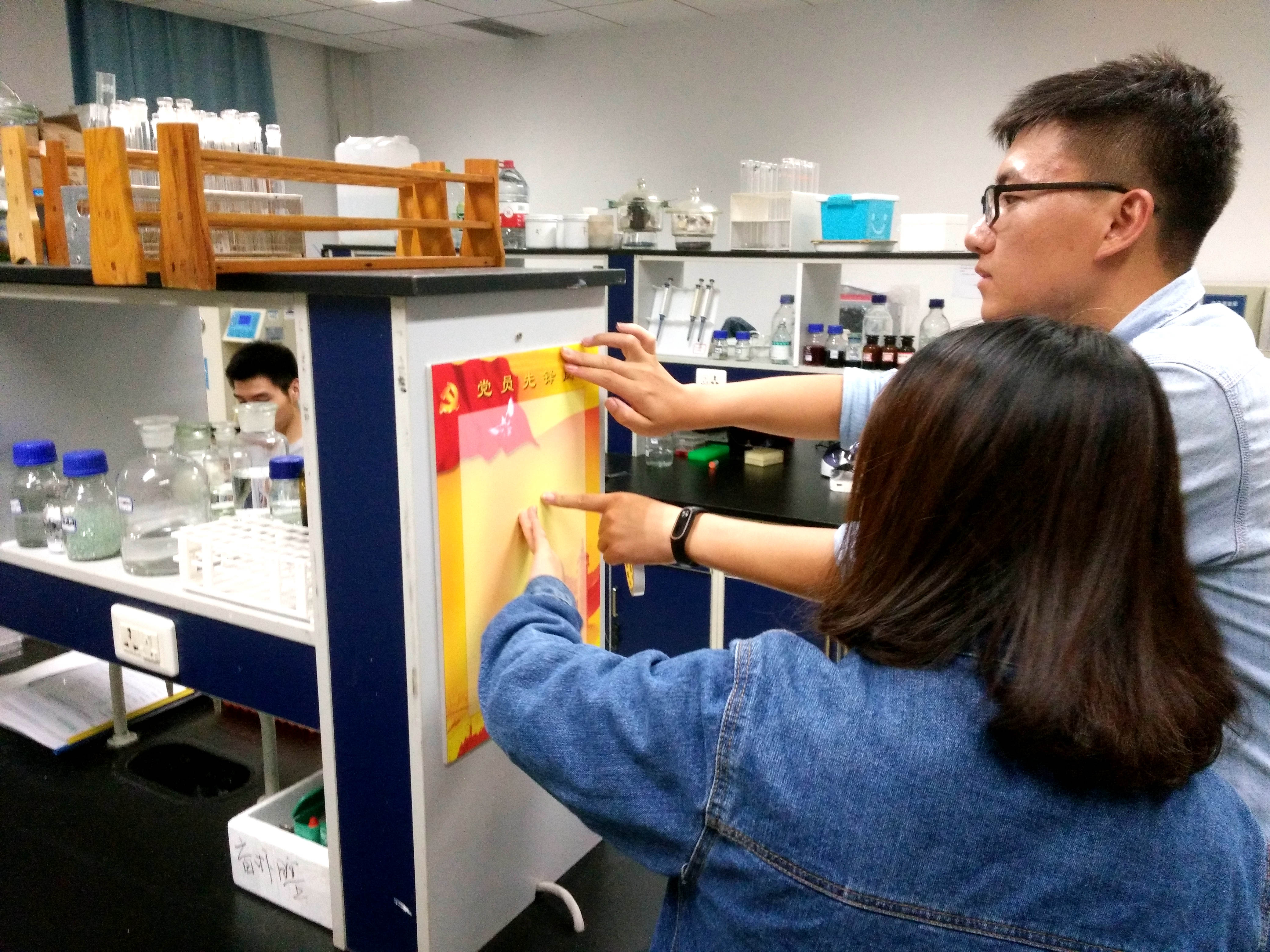 实验室作为研究生开展科研工作的主阵地,其保持安全稳定是非常必要的。为此,支部在前期学习习近平总书记知青岁月的基础上,制作了实验室安全党员先锋岗标牌,支部党员分成几个小组,每个小组负责实验室的一个楼层,小组成员分工明确,团结协作,在各实验室和兄弟支部的积极配合下将实验室安全党员先锋岗标牌张贴于实验室醒目处。张贴标牌后,支部各位党员将分别作为实验室安全检查员负责自己所在实验室的安全保障工作,每天坚持做好实验室安全检查工作,并带动实验室全体同学共同做好实验室安全保障工作。