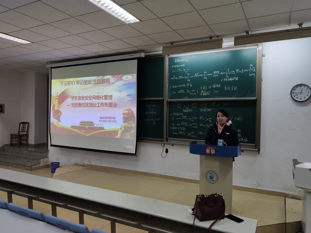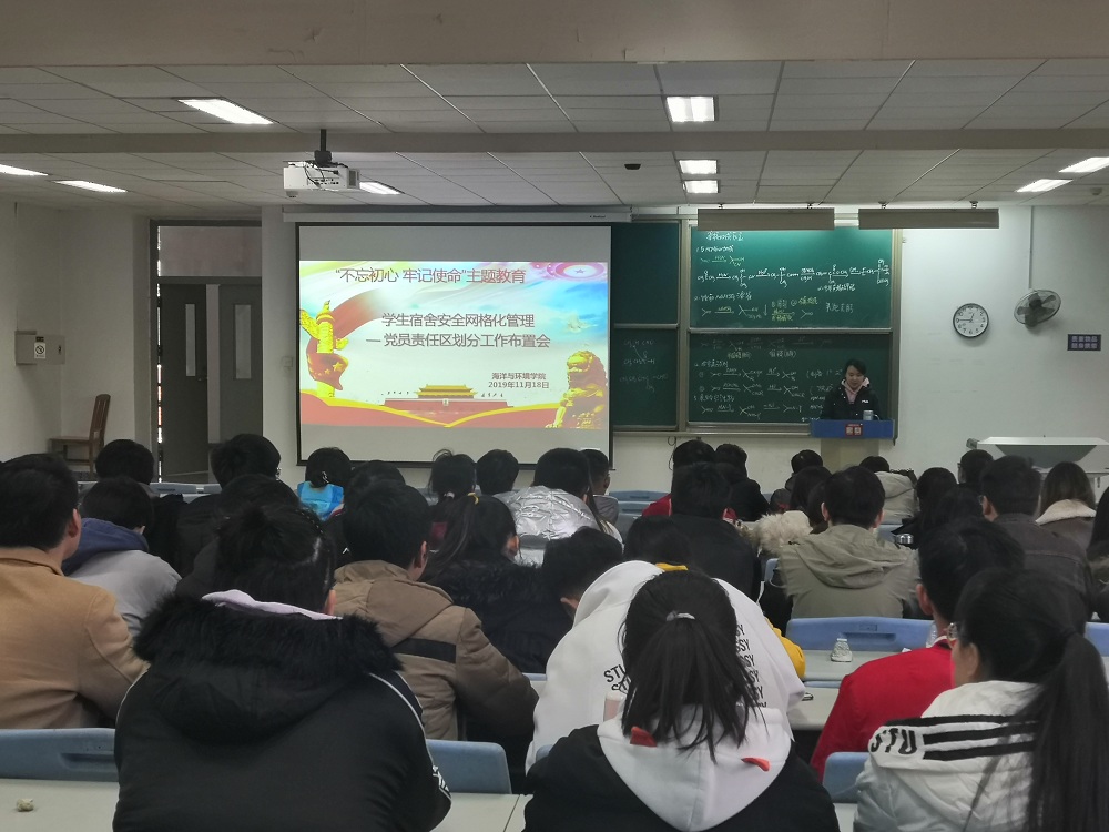 为深入贯彻落实"不忘初心、牢记使命"主题教育精神,稳步推进学院"三全育人"工作,发挥“组织育人”功能,进一步增强学生党员和积极分子的责任意识和服务意识,夯实基层党支部战斗堡垒,海洋与环境学院决定推行学生宿舍安全网格化管理制度。11月18 日,我院在9号楼11阶召开党员责任区划分工作布置会,学院党委副书记金峰、团委书记杜颖华、辅导员许丽娜和张晶老师以及海洋与环境学院全体学生党员、入党积极分子参会。