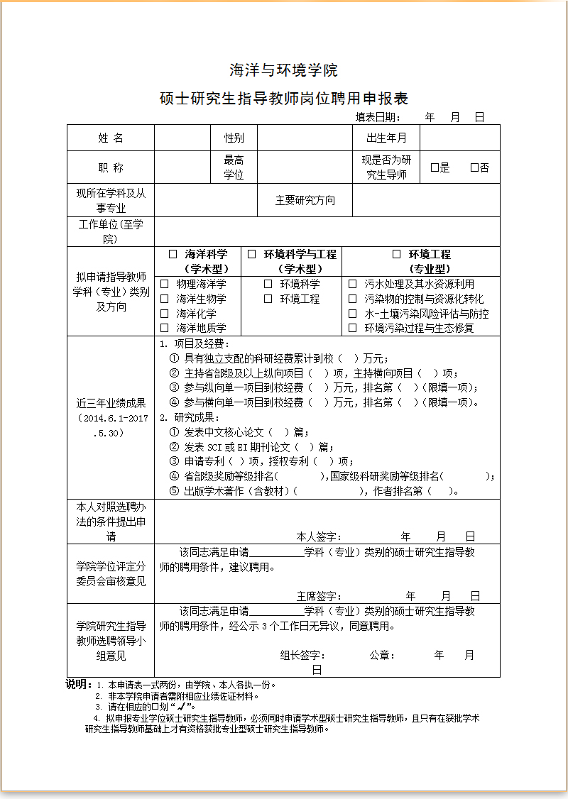 附 件:海洋与环境学院硕士研究生指导教师岗位聘用申报表(请点击链接下载)