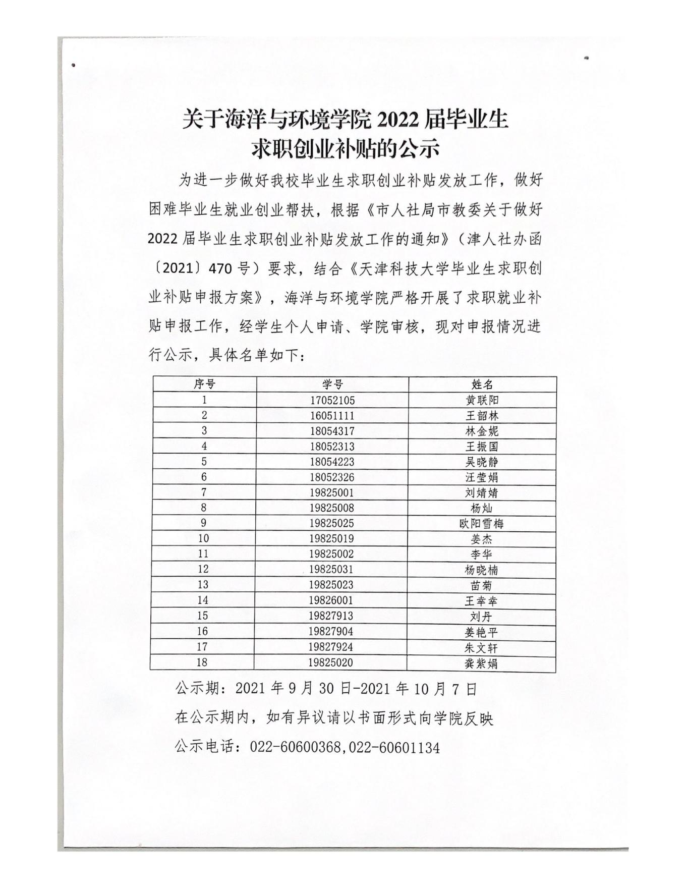关于海洋与环境学院2022届毕业生求职创业补贴的公示