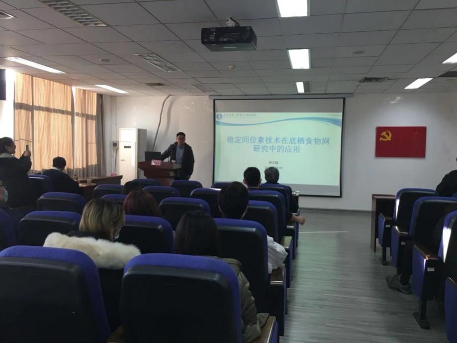 徐文喆博士作了关于《稳定同位素技术在底栖食物网研究中的应用》相关的学术报告,向大家介绍了海洋生物的分类、稳定同位素技术解决动物生态学的主要问题的方法等相关背景知识,并通过自己所做的相关研究为大家讲解如何利用稳定同位素技术研究底栖动物食物来源及营养位阶。