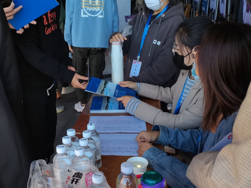 在招聘会开始前,志愿者们便提前到达会场,熟悉环境,了解自己的工作内容,再协调分配工作任务,积极做好前期准备工作。在活动进程中,志愿者们负责会场签到、接待引导、分发瓶装水和毕业生资料等环节。