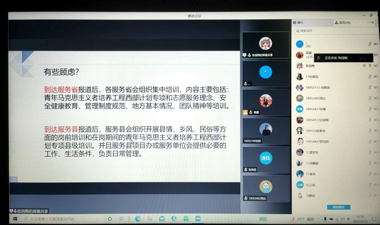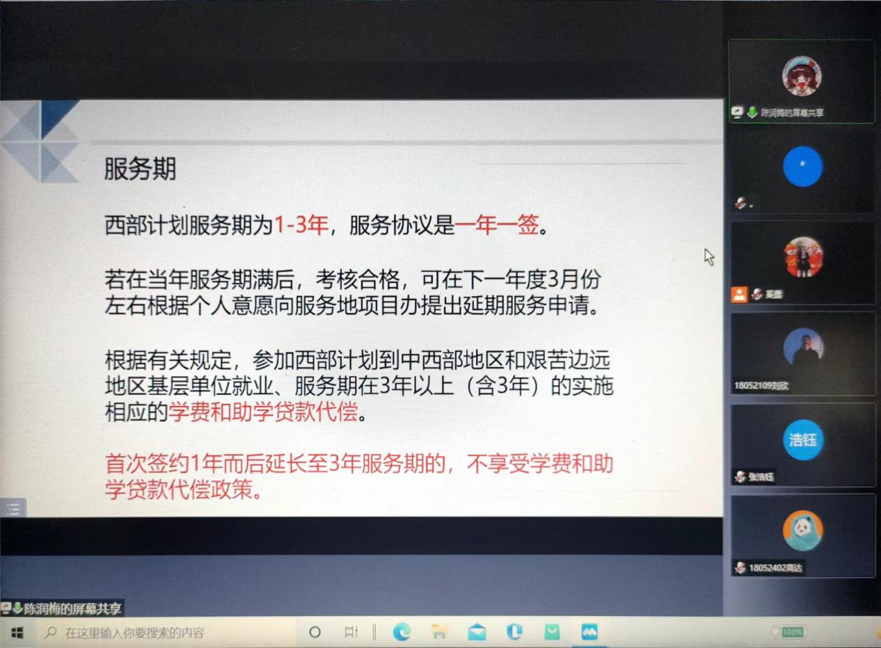 为积极响应国家号召,动员广大毕业生扎根基层,到党和国家需要的地方建功立业,日前,海洋与环境学院线上召开了2022届基层就业宣讲会,学院2021届西部计划志愿者陈润梅同学主讲,2022届全体本科生参加。会议由2018级辅导员奚露老师主持。