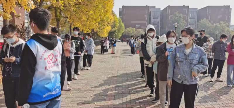 医护人员和学生们到达后,负责秩序维护的志愿者们立即引导同学们在各核酸检测通道有序排队,提醒同学们佩戴口罩,真正做到了高效高质量的疏通和引导工作。