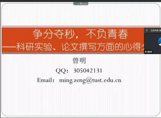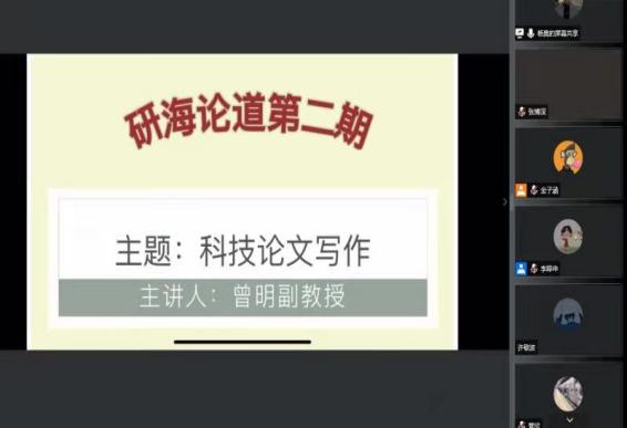 10月8日,海洋与环境学院成功举办“研海论道”第二期。本期由曾明副教授采取线上交流的方式,面向学院全体2020级和2021级研究生,作了题为《争分夺秒,不负青春——科研实验、论文撰写方面的心得》的报告。本次活动由海环学院研究生会承办,研究生辅导员李婷申老师参加了线上活动。