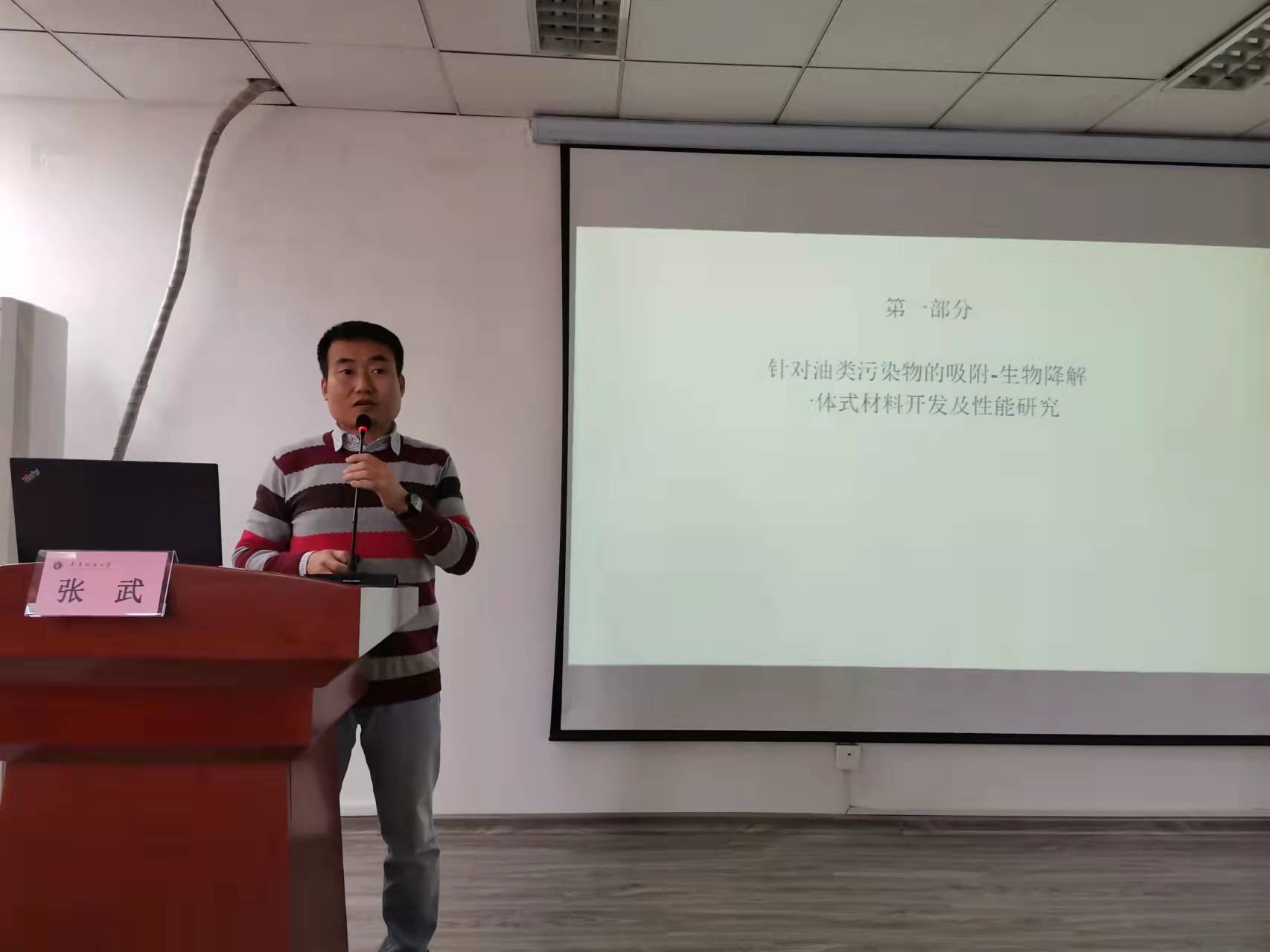 张武博士报告的题目是“吸附-降解复合环境功能材料制备及性能研究”,第一部分通过 “针对油类污染物的吸附-生物降解一体式材料开发及性能研究”向师生详细讲解了磁性吸油材料的制备、高活性降解菌的筛选菌株测序以及复合固定菌的性能研究;第二部分主要介绍了出国访学期间从事的具体工作、取得的成绩、感悟和后续的研究计划。