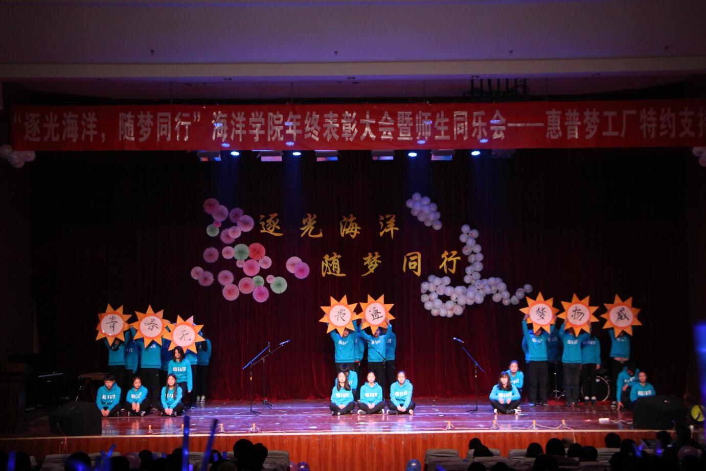 第五章“Now”由海洋学院全体学生会成员献唱的歌曲串烧组成,用充满青春活力的歌声与舞蹈将晚会的气氛推向了高潮,在一片掌声和欢笑声中,此次年终晚会圆满落下了帷幕。