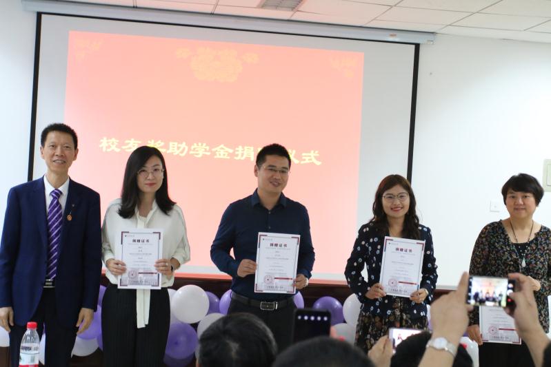 奖助学金捐赠仪式上,天津英伟水产有限公司总经理、我院1988级校友高嵩向学院捐赠两万元科研奖励基金;我院2003级校友闫玲捐赠五千元教育发展基金;天津中环瑞亚环保科技有限公司总经理、我院2007级校友郑吴柯,天津育英教育培训机构校长、我院2009级校友孔玉分别捐赠两万元,用于资助家庭经济困难学生。邓院长代表学院为四位捐款校友颁发了荣誉证书。随后高嵩、郑吴柯、孔玉三位校友分别上台发言。不仅如此,与我院环境工程系王昶教授合作的企业单位也纷纷捐资助学,为学校和学院的教育事业发展贡献力量。