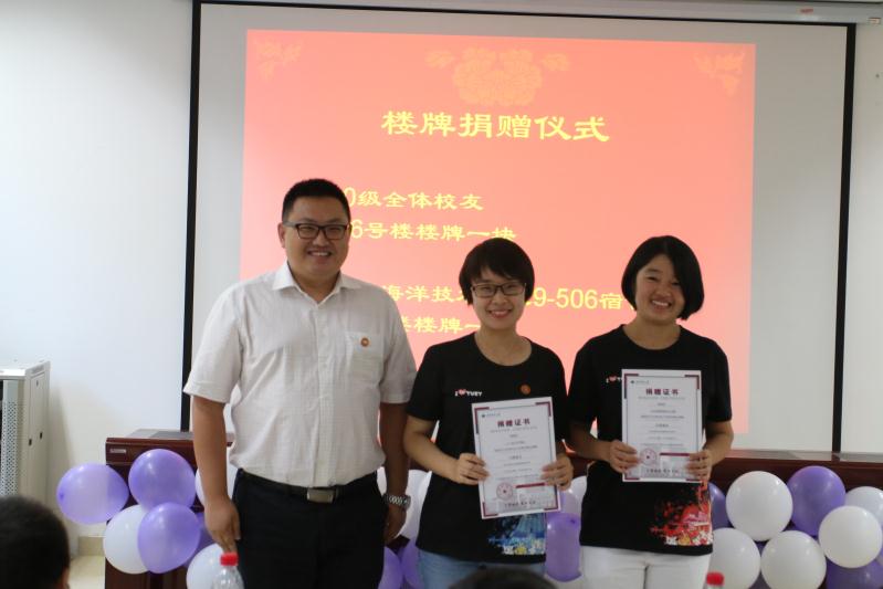 楼牌捐赠仪式上,我院2006级海洋技术专业9-506宿舍和2010级全体学生前期分别为学校捐赠楼牌一块。由于校友没有及时返回母校,荣誉证书由学生在校时辅导员杜颖华老师和王耀环老师代领。我院党委副书记金峰老师为两位老师颁发了证书。