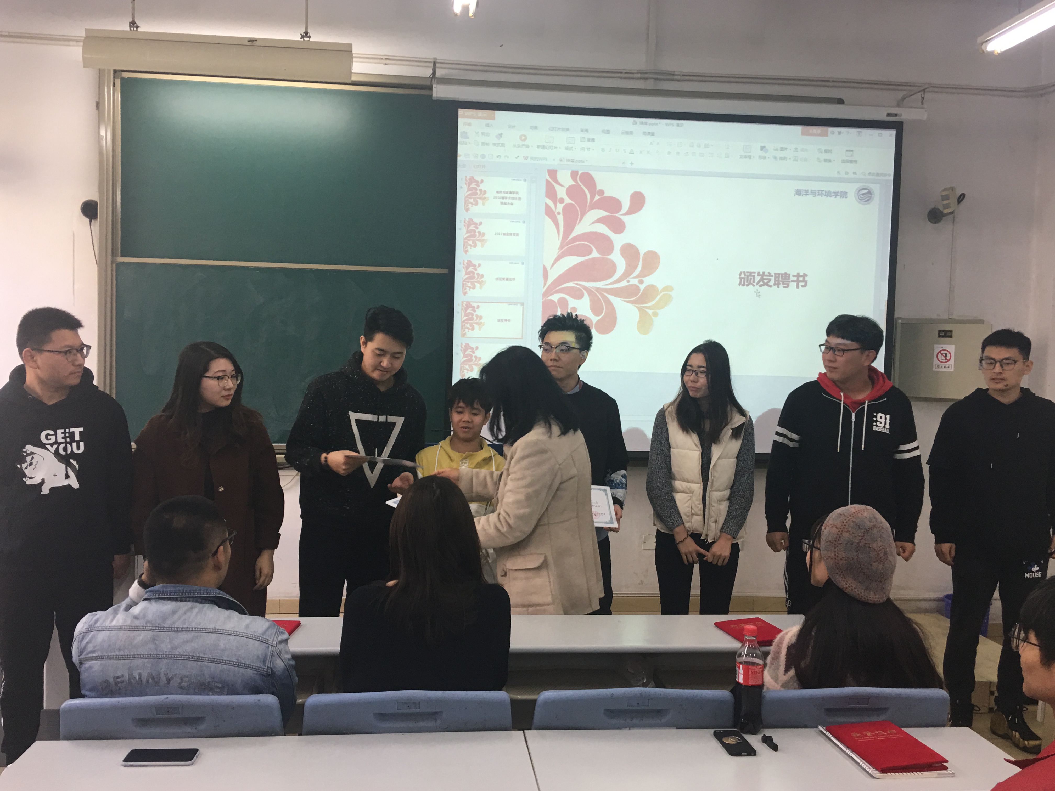 随后,田珺老师为2017届学术性社团主席团颁发荣誉证书,感谢他们对社团做出的贡献,并为2018届学术性社团主席颁发了聘书,希望他们能继续传承我院的优良传统,努力把社团建设的更好。