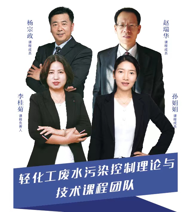 《轻化工废水污染控制理论与技术》课程教学团队由4位教师组成。该课程团队基于本课程的教学创新改革,入选由中央宣传部等联合主办的“奋进新时代”主题成就展(全国55门,天津市2门),在二十大期间展示,并入选国家高等教育智慧教育平台。该课程先后评为天津市课程思政示范课和天津市工程专业学位优秀课程奖。
