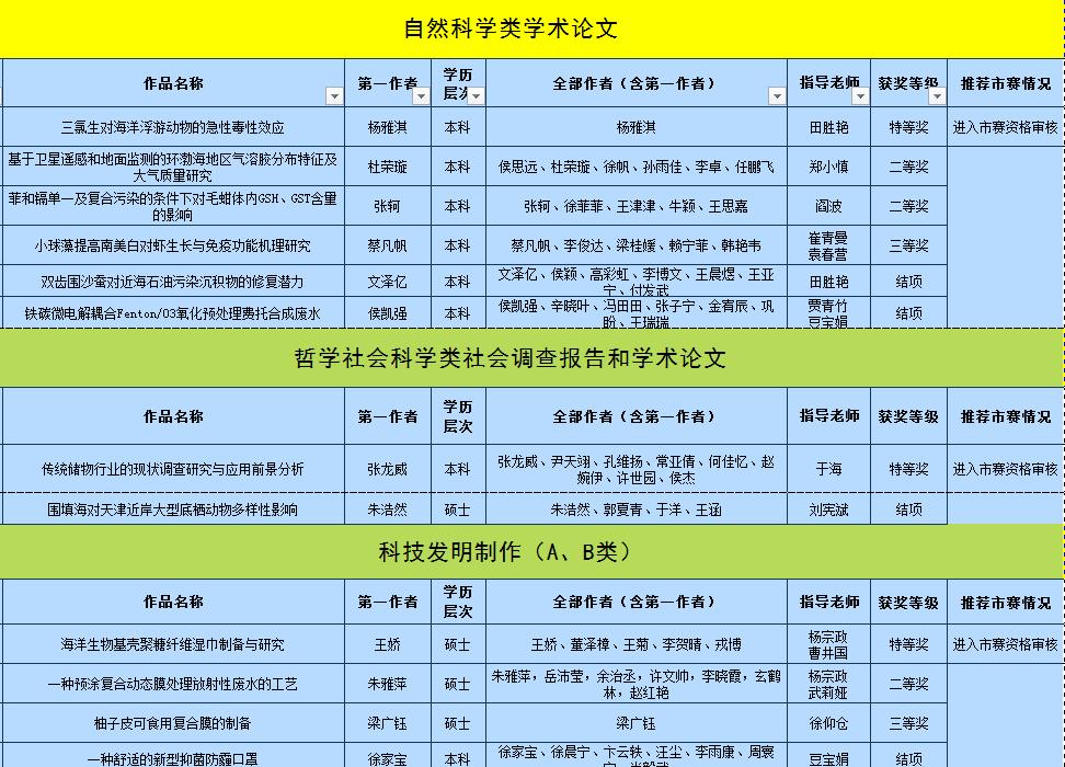 近日,“挑战杯”天津欧美性爱免费大学生课外学术科技作品竞赛结果公布,海洋与环境学院在竞赛中斩获佳绩,2项作品荣获三等奖,3项作品荣获二等奖,3项作品荣获特等奖并推荐参加天津市级竞赛。