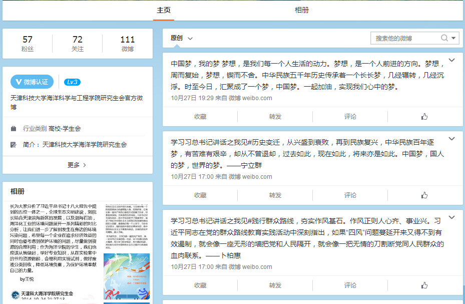 同学们深刻认识到政论片《百年潮•中国梦》的积极意义和现实意义,在认真观看影片后结合习近平总书记系列重要讲话积极展开了热烈的讨论。活动后,同学们不仅写下了学习习近平总书记系列重要讲话的心得体会,而且还在学院研究生会的新浪官方微博“天津科大海洋学院研究生会”中发表了“学习习近平总书记讲话之我见#......”的感悟微博,彰显出同学们积极追求思想进步、努力提高政治觉悟的正能量。
