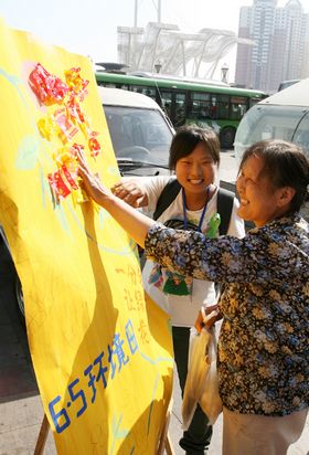 今天,在“世界环境日”即将来临之际,在滨海新区海河外滩广场上出现了一群青年人,他们一面向过往的行人发放统一的手套,带领大家一起捡拾广场和道路上的垃圾,一面向捡完垃圾的路人发放糖果,并引导大家将吃剩的糖纸贴在特意制作的宣传板上,拼绘出一幅幅美丽的图画。