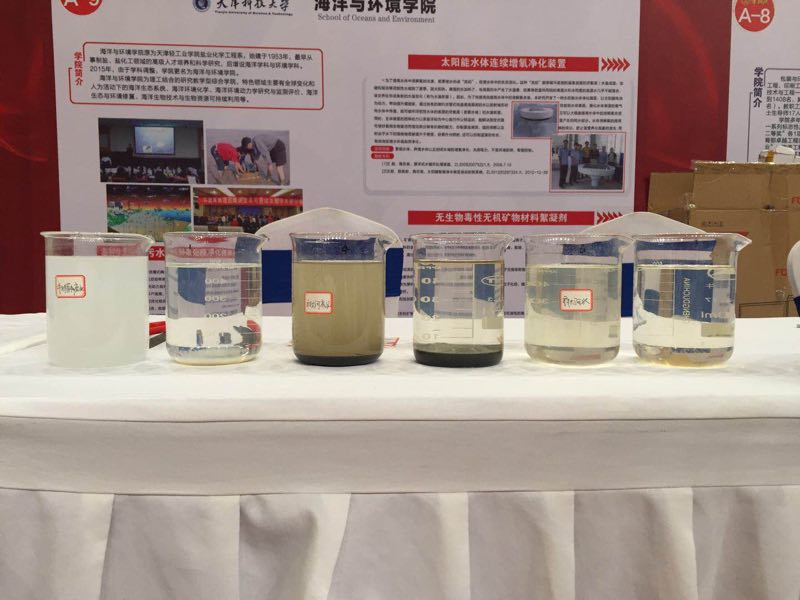 图2 六十周年校庆产品展示(牛奶废水、河道清淤、河水絮凝前后对比)