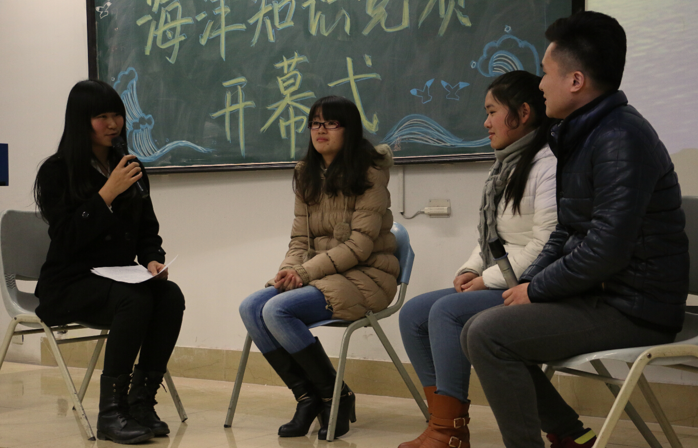 最后为了让同学们更加深入了解这次比赛,我们也邀请了参加过全国第六届海洋知识竞赛的学长学姐和带队老师来到现场,针对比赛经历进行了访谈。李传旭学长表示 ,作为一个参赛者,认真对待比赛是十分重要的,除此之外,密切关注海洋时事新闻和前沿科技也对比赛十分有帮助。而刘雪学姐则强调了团队合作,你问我答,收获更大。
