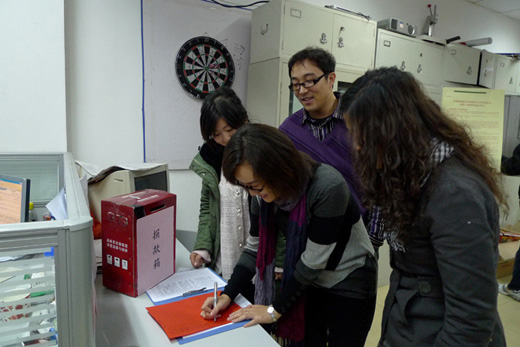 捐款箱静静地摆在桌子上,更多地平时在学院内默默无闻的老师轻轻走进来,写下自己的名字,把钱投进捐款箱,然后悄悄地离开。