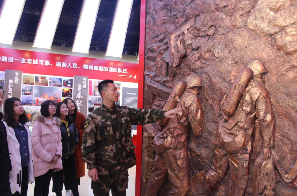 首先,在中队的“8.12”消防救援纪念馆中,八大街公安消防中队代理中队长张梦杰向我们详细介绍了中队参加“8.12”消防救援的光荣事迹。从形象生动的“最美逆行”浮雕,到“8.12”爆炸中的器械残骸,再到灾情救援中消防官兵的英勇身影,每一个场景都深深的给同学们上了一课,对“8.12”救援中的消防英雄们产生了崇高的敬仰之情,他们把生的希望留给群众,把死的危险留给自己,用自己宝贵的生命践行着对党忠诚,甘于奉献的坚定信念,以实际行动证明了人民消防为人民的服务宗旨。