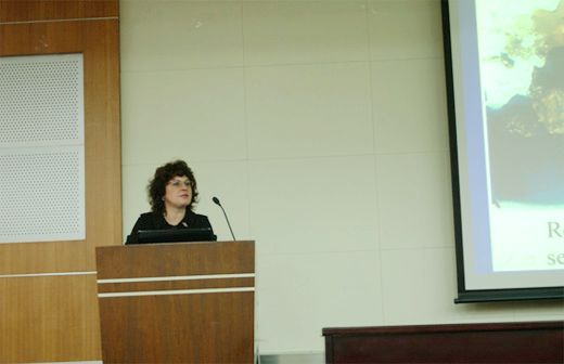 下午Elena Rush教授与海洋科学与工程学院副院长王昶教授、刘宪斌教授一起共同在泰达图书馆第一报告厅为我校师生员工奉献了一场别开生面的、中西合璧的教授论坛。本次教授论坛由海洋科学与工程学院副院长唐娜教授主持。Elena Rush教授在为大家奉献一场题为《俄罗斯西伯利亚地区水处理研究》的学术报告的同时,还向大家介绍了伊尔库兹克国立交通大学概况、第一届科技应用国际网络会议和2010伊尔库兹克科技夏令营的情况。作为对来访客人的欢迎,王昶教授和刘宪斌教授分别使用英语做了题为《净化槽中的生物滤床对家庭生活污水处理的影响》和《河口及近岸海域生态系统健康的几个科学问题》的学术报告。