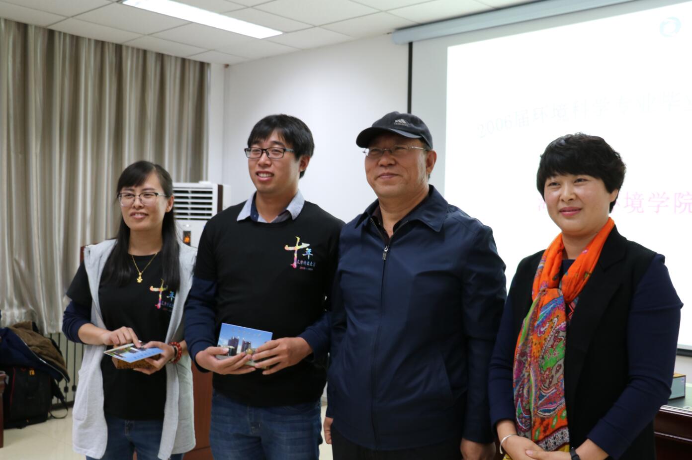 党委副书记金峰、环境科学与工程系主任李海明、院办主任张越男、学办主任杜颖华、教学秘书王运花纷纷回顾了学院十年间的巨大变化,并希望各位校友在工作之余,常回家看看。环科专业李英、孙佐辉、刘占广、白晓琴等老师与学生们一起回忆了十年前课上课下的点点滴滴,一幕幕场景历历在目,老师们坦言现在想起来都还是满满的感动。其中,李英老师笑着讲道,“你们是我教过的第一届学生,记得那时给你们上课我还是很紧张的呢”引来了现场阵阵笑声。