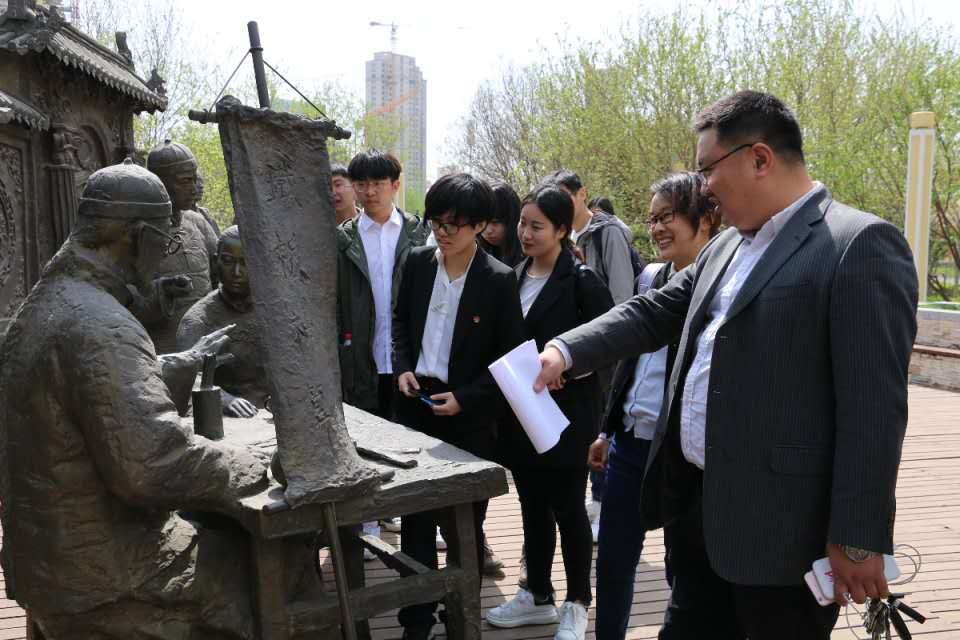 在生态谷公园内,全体团员参观了从精卫填海到改革开放的人物雕塑和历史事件,漫步在初春的绿茵小路,同学们更直观地了解了天津抗战、小站练兵、五四运动、解放战争等各个历史时期的重要事件、重要人物和民风民俗。