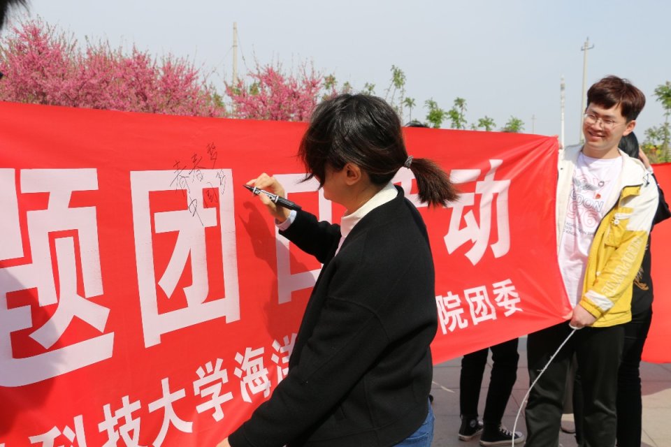 最后,金峰副书记寄语全体团员,号召大家坚定理想信念,矢志建功立业,发扬和传承好以爱国主义为核心的民族精神和五四精神,积极投身到新时代中国特色社会主义的建设中去,时刻铭记校训与院训精神,努力学习专业文化知识,为服务好津京冀协同发展贡献力量。同学们认真聆听后,饱含深情地齐唱中国共青团团歌。活动结束后,老师及同学们在横幅上写下了本次活动中获得的感悟和对未来的期望。