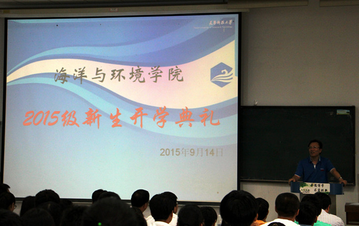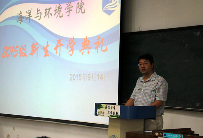 2015年9月14日下午,海洋与环境学院2015级新生开学典礼在图书馆十七阶隆重举行。学院党委书记张春艳、院长孙军携领导班子全体成员集体亮相,各系主任、院办学办老师及班导师代表出席典礼。2015级新生辅导员王晓婧主持典礼。
