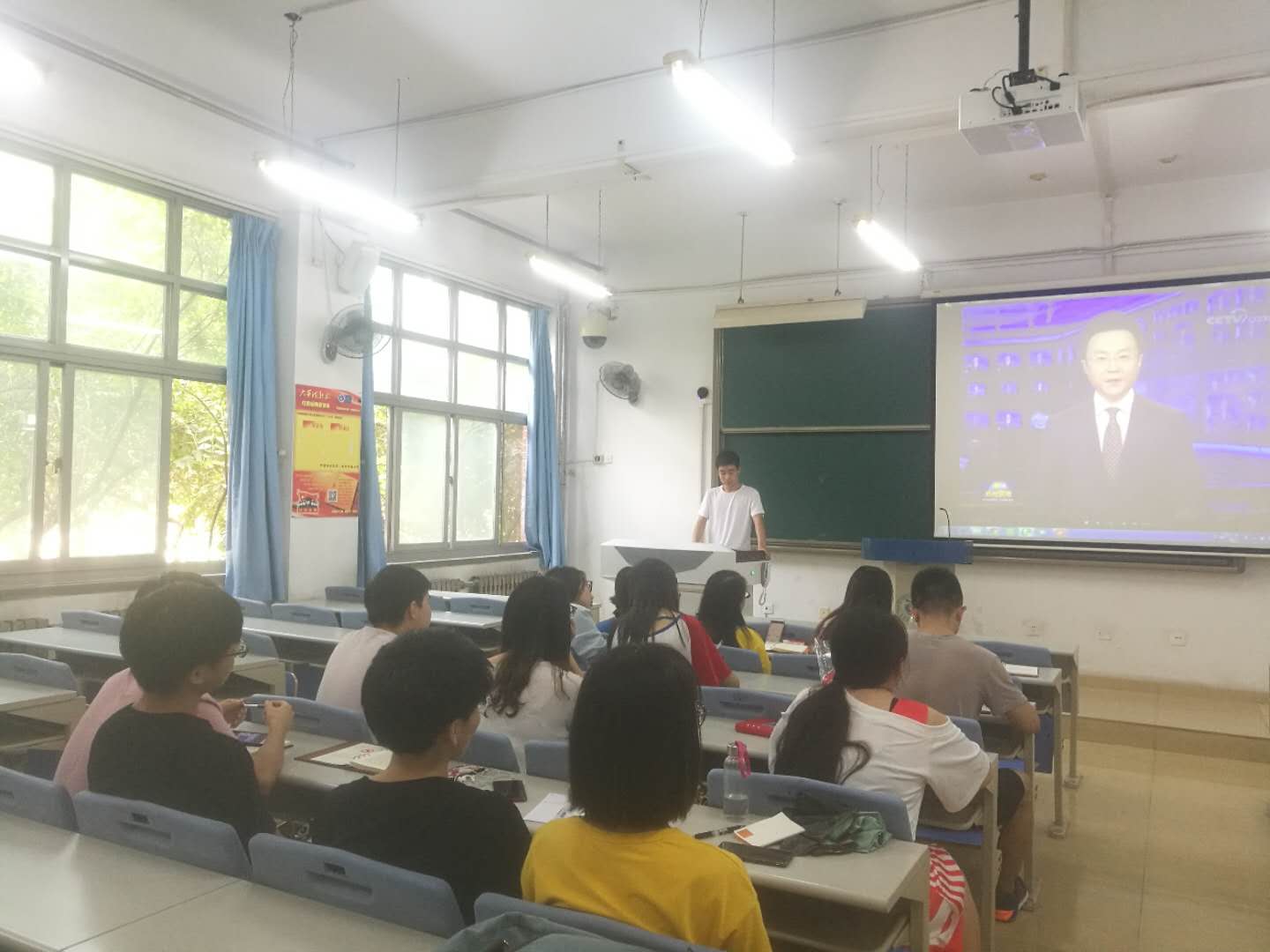 党课上,杨老师首先以习近平总书记等国家领导人参观中共一大会址和瞻仰嘉兴南湖红船为引入点,围绕中国共产党的成立和党的指导思想展开了讲解。杨老师为同学们介绍了中国共产党带领全国人民为了民族独立、人民解放、国家富强等进行的艰苦奋斗,分享了“陈望道沾着墨汁吃粽子还说味道很甜……”的故事。随后,杨老师又围绕“四个伟大”为支部的党员讲解了新时代党的历史使命,要求同学们要始终坚持党的领导,坚持走中国特色社会主义道路,脚踏实地,勇于进行自我革新,不断提升自己各方面的能力,做新时代的建设者。
