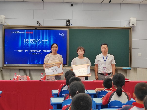 仪式上,海洋与环境学院代表丁昌玲博士与北塘第一小学校长陈学东共同签署了《协同育人“教联体”共建协议》。根据协议,双方将充分发挥海洋与环境学院的学科专业优势,将前沿海洋科技知识、科学探索精神及海洋生态保护理念融入小学基础教育实践。丁昌玲博士在现场受聘为北塘第一小学科技副校长,陈学东校长为其颁发聘书。此次受聘,她将依托学院丰富的海洋科教资源,积极参与指导学校的海洋特色课程建设和学生科创活动,为培养小学生的海洋素养和环保责任感提供专业引领和资源支撑。