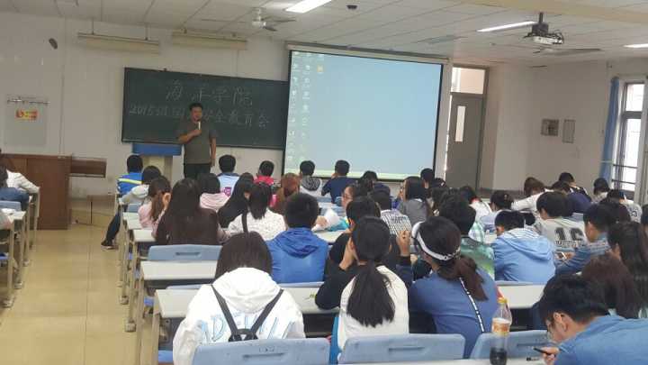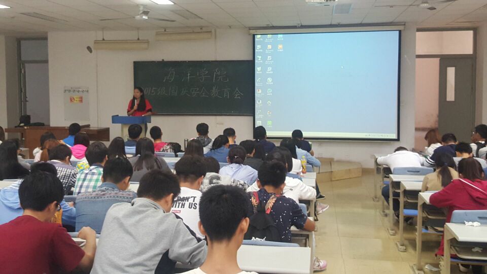 为增强学生安全防范意识,确保同学们度过一个安全、愉快的十一假期,9月29日中午,海洋学院2015级国庆假期安全教育会在泰达中区图书馆第二阶梯教室召开。会议由15级辅导员王晓婧老师主持,学院党委副书记金峰和全体15级学生参会。