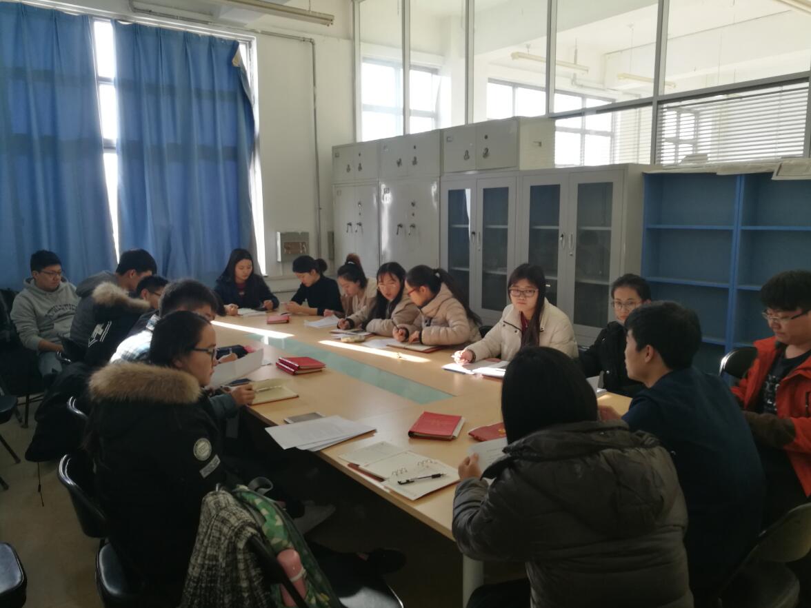 为贯彻落实“两学一做”常态化、制度化学习要求,加强支部党员对十九大精神的学习领会,12月26日中午,环境工程本科生党支部于泰达中校区4号楼201教室进行了专题三研讨,研讨的主题为“学习贯彻党的十九大精神,为天津之为干事创业担当作为”,会议由支部书记杨悦主持,支部全体党员参会。