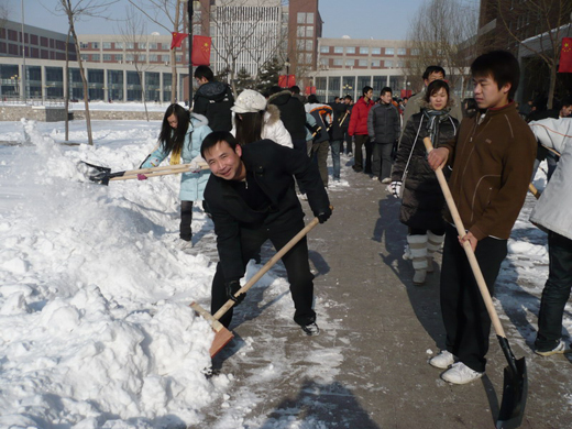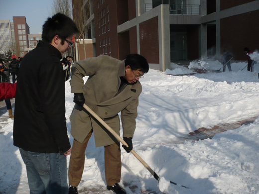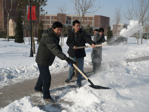 1月6日,雪后放晴,旭日东升。为了确保泰达校区道路畅通和行人、车辆安全,保障正常的教学秩序,海洋学院刘文岭书记、崔永根副书记、王昶副院长身先士卒,带领全院200余名师生展开了一场热火朝天的扫雪铲冰工作。