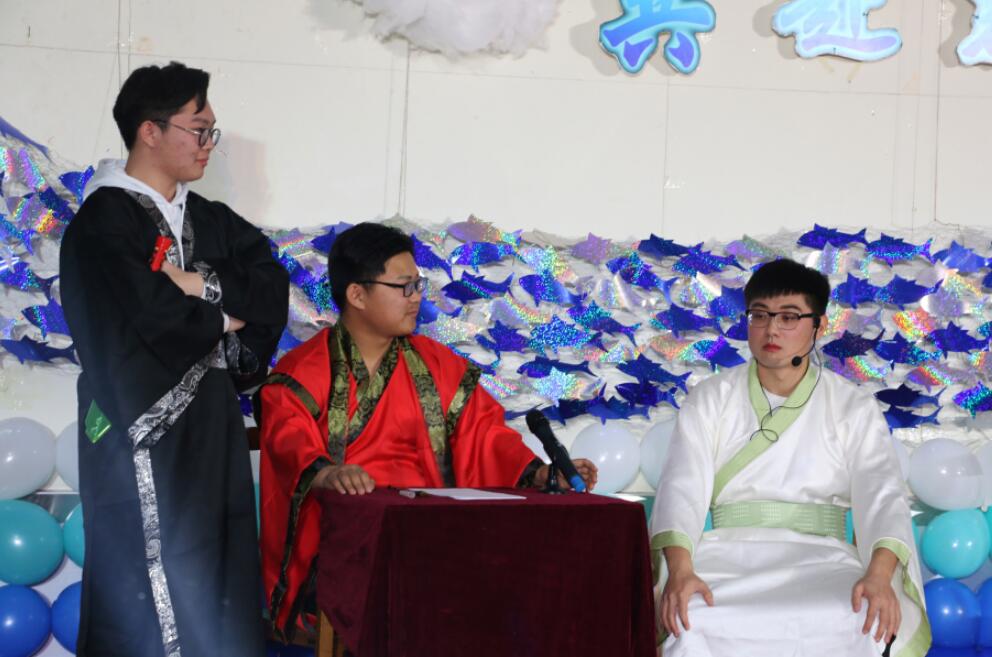 中篇以“携手共庆”为主题,不仅道出了在场师生共同的心声,更是烘托出满场热烈喜庆的气氛。王昶教授以一首日文歌曲《山茶花》触动了观众柔软的心房,他唱出了对家人、老师、朋友一路陪伴的感激,极富异域风情的曲调温柔磨亮了沧桑。 一首《团结就是力量》 让在场师生看到了我院领导班子的精气神以及他们为推动学院进步的坚定信念。大一与大二学生共同表演的历史剧《信使》,展现了我院学子们的智慧与机敏。学办老师们带来的歌曲串烧动人心弦,台上台下互动气氛热烈。辅导员杨悦与董春明老师合唱的《风吹麦浪》、辅导员田珺与李恒旭老师的一曲《明明白白我的心》、院党委副书记金峰与团委书记杜颖华老师深情对唱的《我要你》,辅导员老师们一句句走心的歌词,如小桥流水温婉流淌进每个人的心田,令现场掌声此起彼伏,叫好声不断。