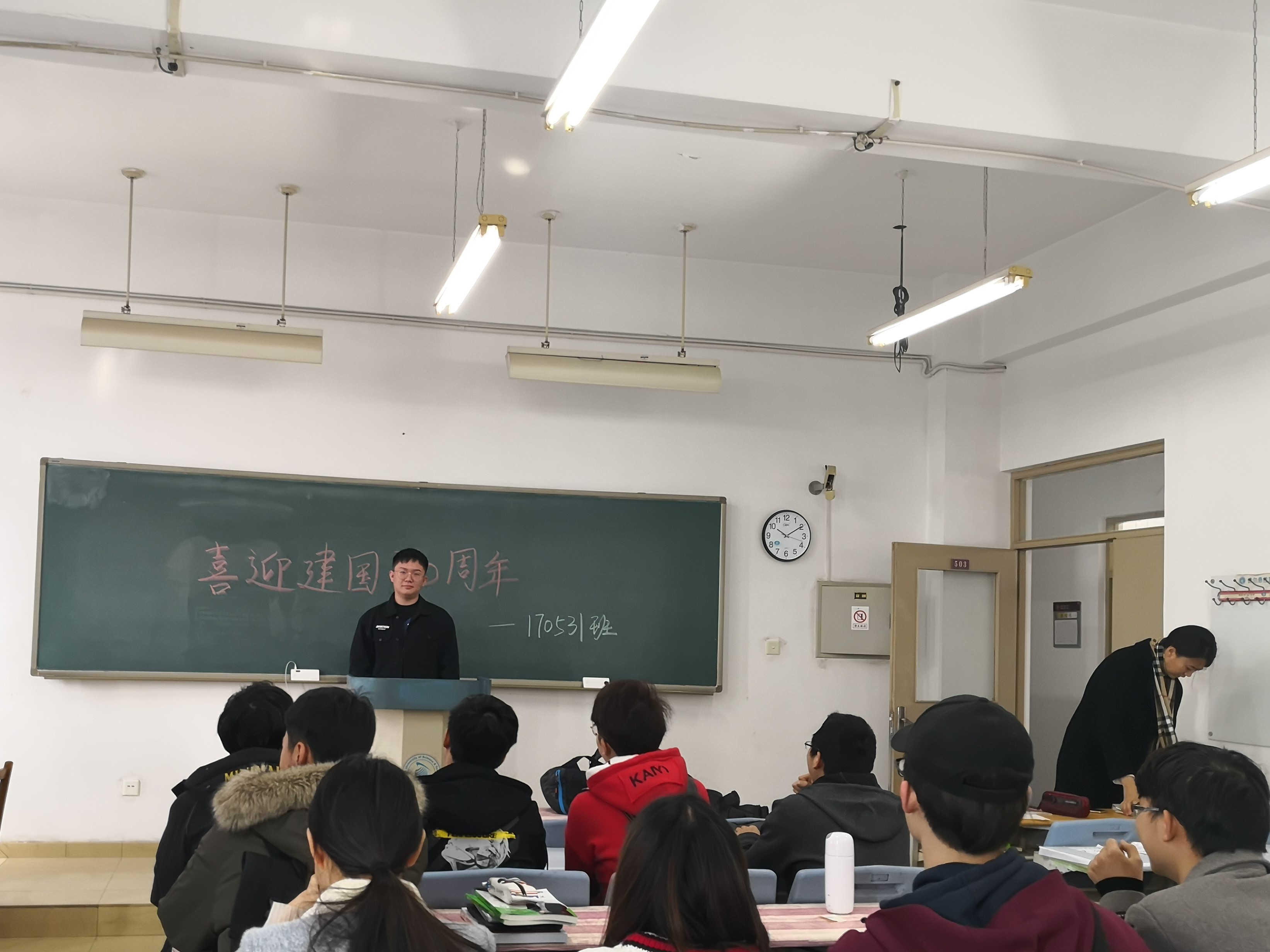 170531班团支部组织了集体讨论,同学们轮流发言,表达内心的想法和感受,班级讨论气氛热烈,大家总结了祖国70年来光辉历程并表示要为实现中华民族伟大复兴的中国梦努力奋斗,同学们深受鼓舞和激励。
