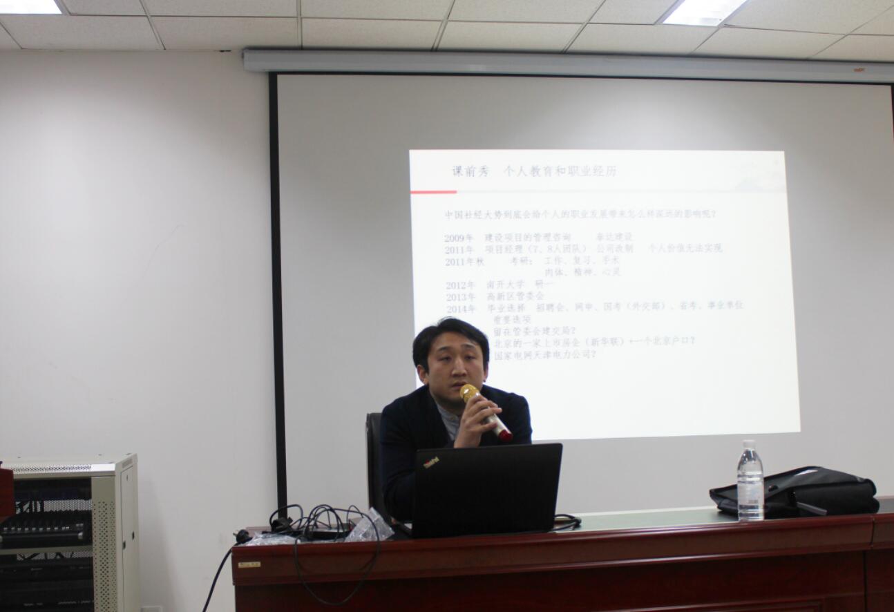 本讲邀请到我院环境科学专业2009届校友、国家电网天津电力公司建设部前期专员刘轩豪先生担任主讲嘉宾,讲座主题为“中国社经大势与个人职业发展”。