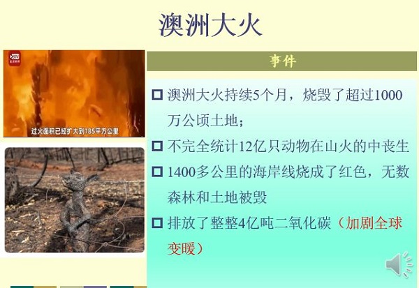 澳洲大火65亿只蝙蝠飞出,蝙蝠早被证实是地球上著名的“移动病毒库”,身上携带超过100多种病毒。这么多蝙蝠近距离接触人类,其后果真是后患无穷,疫情会频发。大火排放了整整4亿吨二氧化碳,相当于比全球100多个二氧化碳排放量最低国家年排放量总和还要高。温室气体的排放加快了全球变暖的步伐。全球变暖促使永久冻土层解冻,在此地区消失近百年的病毒,卷土重来。冰川消融的同时,冰冻甲烷也将随之流出。甲烷是另一种温室气体,其破坏大气层的能力是二氧化碳的25倍。形成“变暖-冰川融化-甲烷流出-再变暖”的死循环。而抑制全球变暖的速度,大气污染治理又尤为重要。所以学好专业知识,建设碧水蓝天的美丽中国需要环境专业的学生拼搏进取。