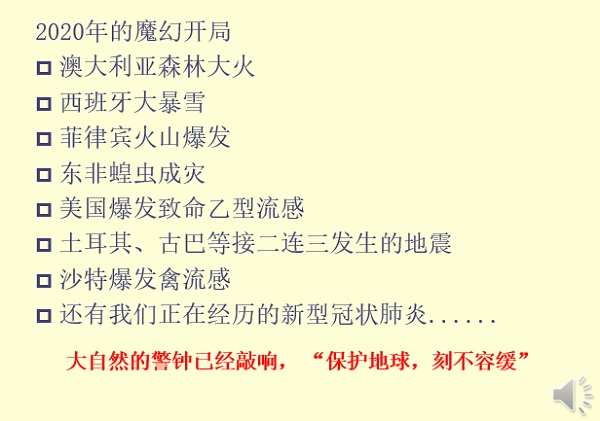 2020年的魔幻开局,让我们每个人都感慨万千,澳大利亚森林大火、西班牙大暴雪、菲律宾火山爆发,东非蝗虫成灾、美国爆发致命乙型流感;土耳其、古巴等接二连三发生的地震;沙特爆发禽流感;还有我们正在经历的新型冠状肺炎。。。。。这一连串的灾害与环境有关,有些是原生环境问题,有些是次生环境问题。