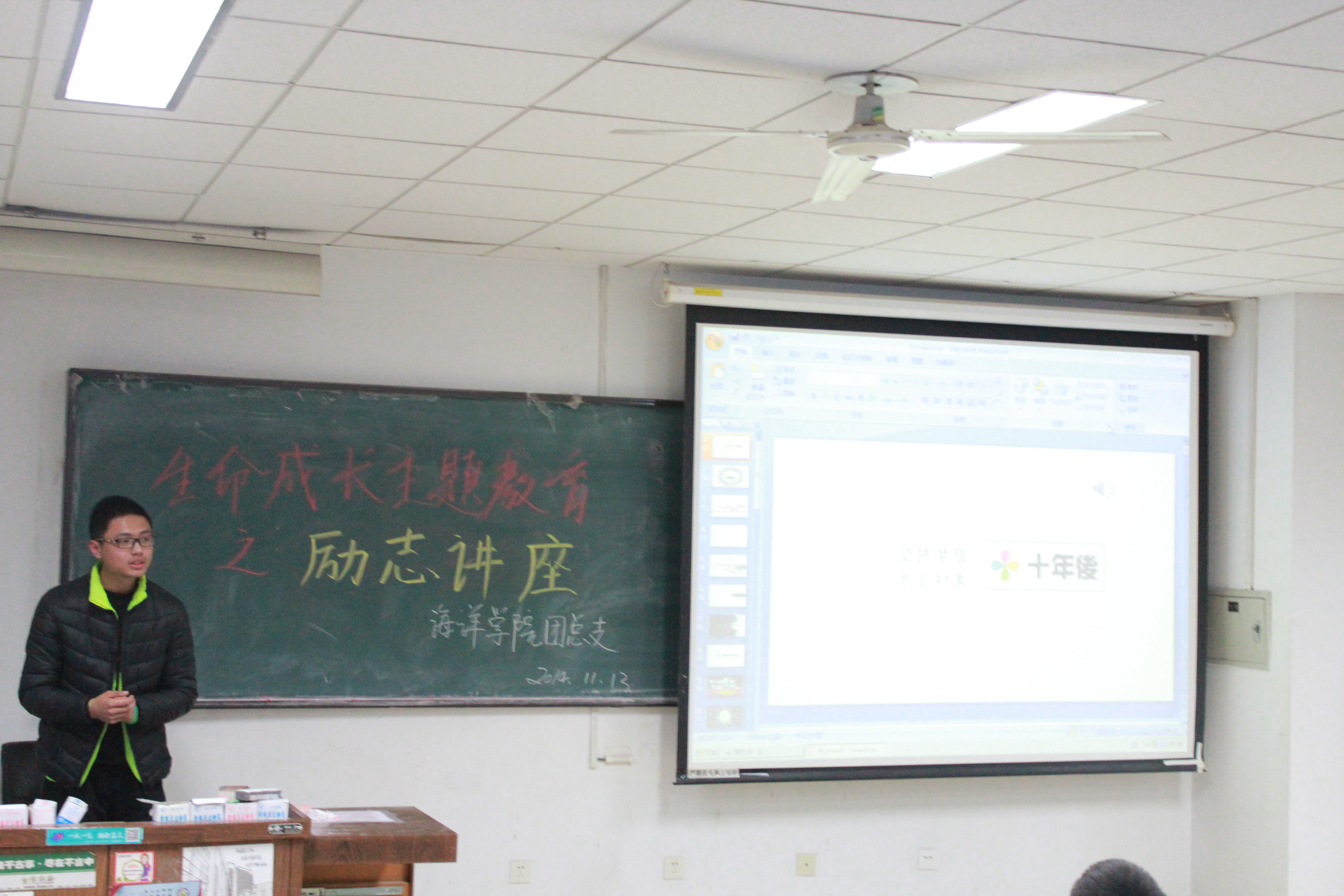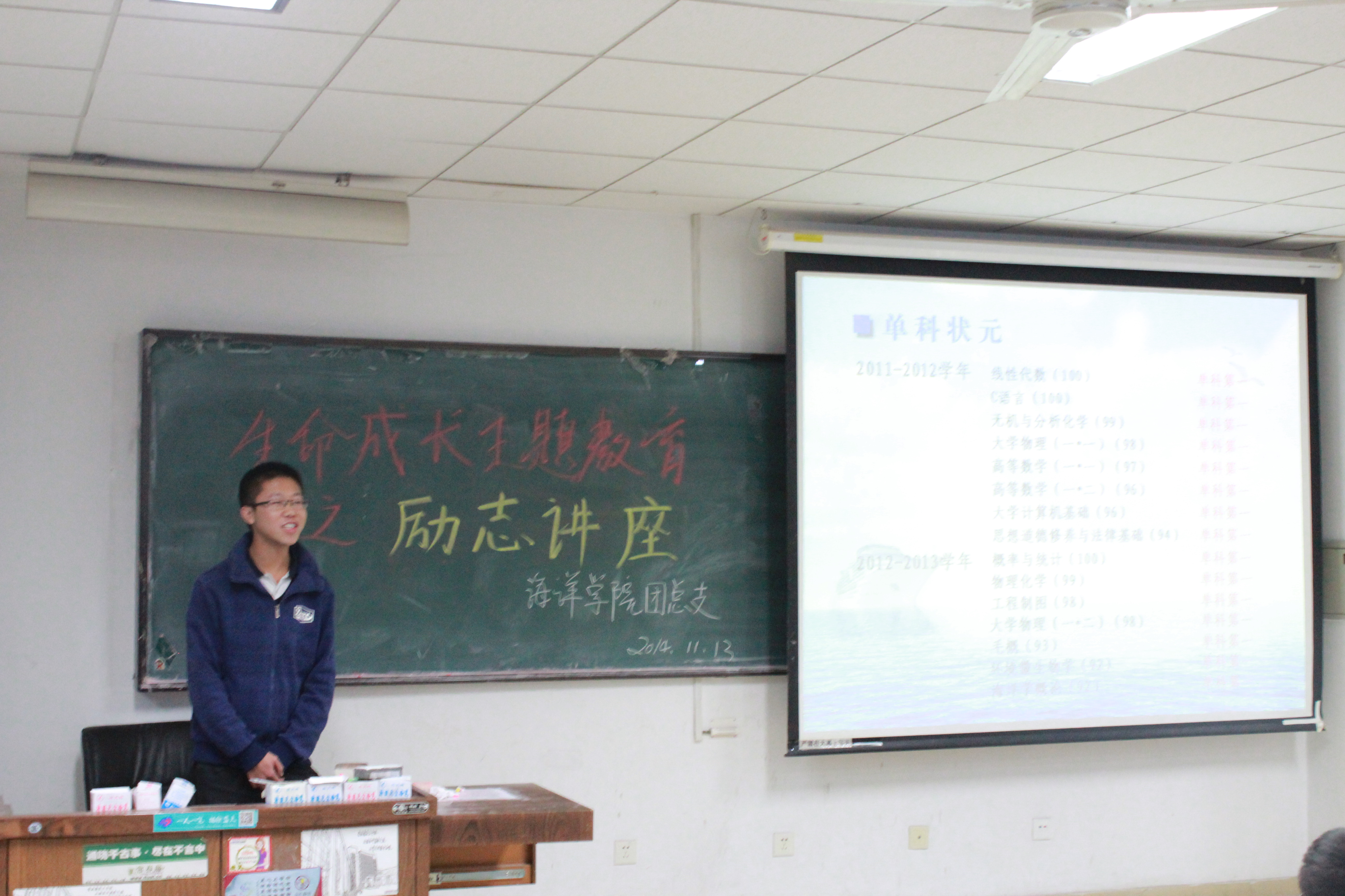 2014年11月13日下午6时,为充分发挥优秀学长和先进集体的榜样作用,营造“比学赶超”的浓厚氛围,激励广大学生学习先进、赶超先进、争当先进,“生命成长主题教育之励志讲座”在海洋学院团总支的精心组织下举行,14级各专业新生积极参加。